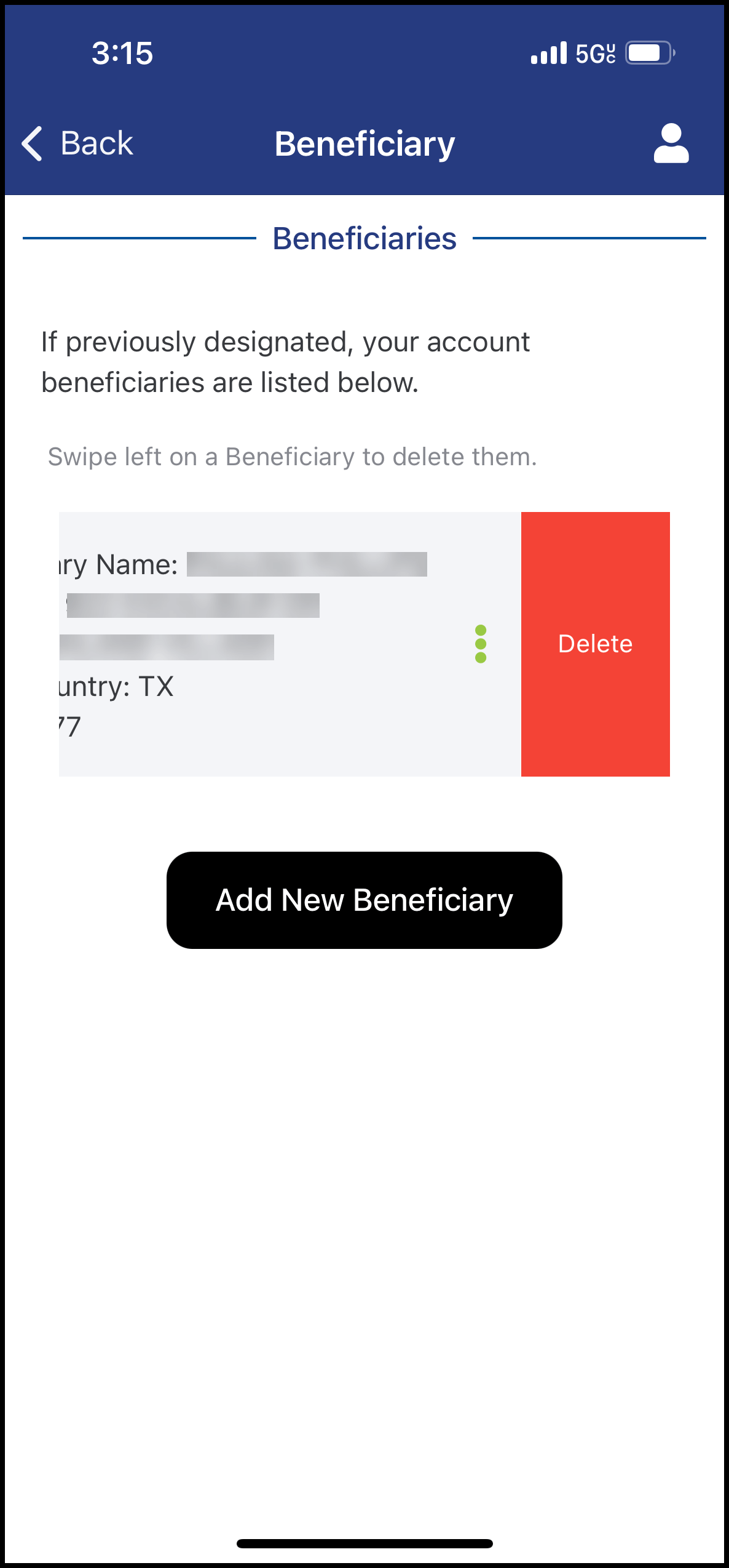 - Remove a beneficiary by swiping left and selecting "Delete"