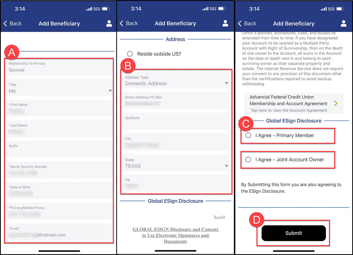 Note: To update a beneficiary's information, first delete the current beneficiary (Step 7), then re-add them with the updated details (Steps 4–6).