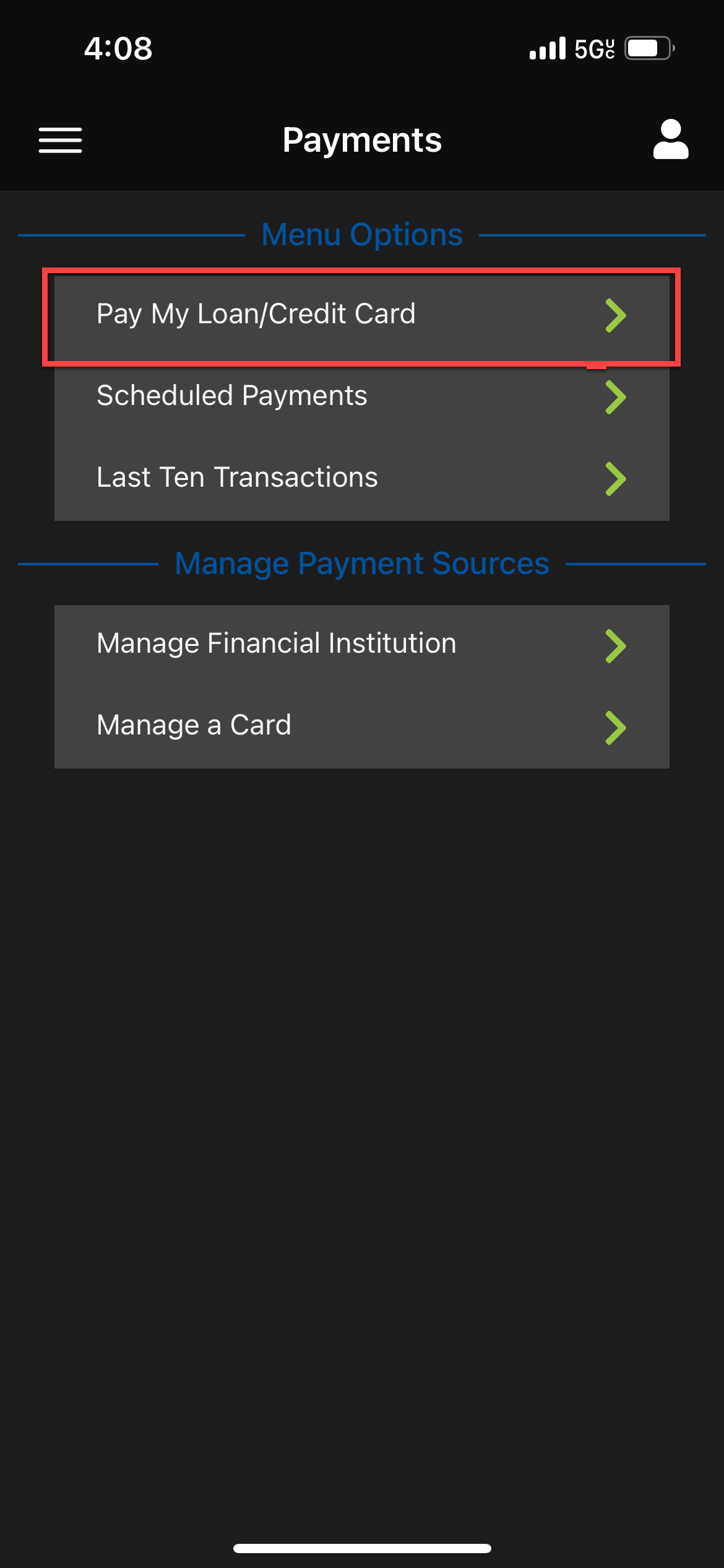 - Select "Pay my Loan/Credit Card"