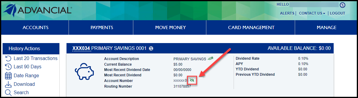 - When the eye icon is clicked, the full Account Number will be displayed
