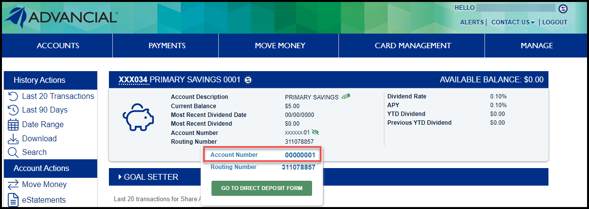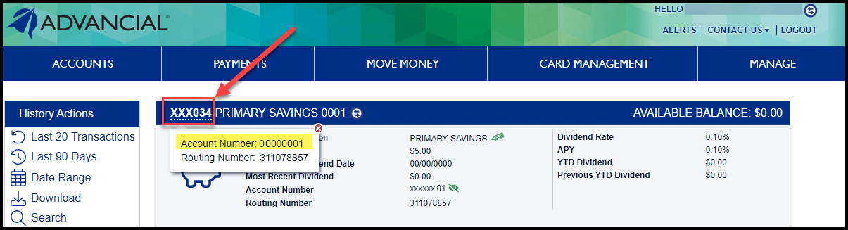 - You may also click on the header bar to reveal the Account Number