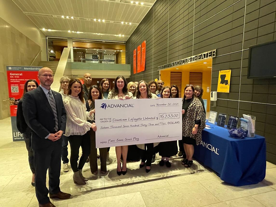 LAFAYETTE, La. (December 1, 2021) – Advancial Federal Credit Union announced the results of its Swipe and Support campaign yesterday at a public forum for Downtown Lafayette Unlimited (DLU). Local Advancial employees presented DLU leadership with a check for $16,733 for the Parc Sans Souci Play project. The final amount far exceeded the campaign’s original goal of $15,000.